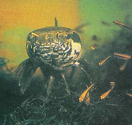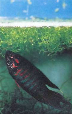 Самец африканского змееголова (Channa obscura) охраняет молодь |