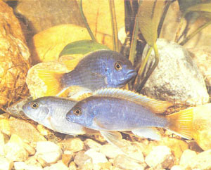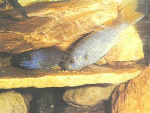 Pseudotropheus «acii» — относительный новичок в аквариумном хобби. Впервые я узнал о существовании этого вида в 1983 г. в Польше, а в 1985 г. мне удалось достать шесть трехсантиметровых экземпляров. Воистину это было удачное приобретение, потому что псевдотрофеусы позволили мне сделать несколько очень необычных наблюдений и выявить особенности поведения, о наличии которых у рыб, инкубирующих икру во рту, я и не подозревал. Наблюдая за взрослыми особями вида, вы обнаружите, что по форме тела и поведению они заметно отличаются от обычных псевдотрофеусов. Я даже склонен думать, что Р. «acii» относится к роду Haplochromis, хотя пришел к этому выводу только с учетом очень специфических особенностей вида, которые для систематиков могут быть не столь важны. У P. «acii» отменный аппетит, они все время голодны и готовы есть постоянно, лишь бы было что. Не раз мне приходила мысль о том, что мои питомцы заразились в общем аквариуме какими-то паразитами, но это было просто переедание, так как у других рыб не появлялось ни малейших признаков заболевания. В десять месяцев псевдотрофеусы достигли половой зрелости, но половой диморфизм у самцов и самок был очень незначительным. Взрослые и молодые рыбы также очень похожи, хотя более старые особи обычно темнее. Я предполагал, что самки имеют только одно оранжевое пятно на анальном плавнике, а у самцов их три или больше, и тщательное исследование анальной зоны рыб подтвердило это предположение.