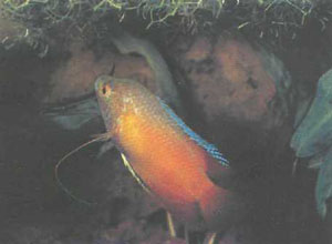 Ну, а где же потомство из домашних аквариумов? Описывая новые мутации, авторы статей всегда подчеркивали, что каждая разновидность фертильна и легко поддается разведению. Я же должен признаться, что не знаю ни одного случая качественного и количественного успешного нереста, например, красного лялиуса. Либо приобретенные в зоомагазине экземпляры вообще отказывались размножаться в аквариуме, либо любители, с которыми я знаком, добивались не лучших результатов, чем я. Однажды в аквариуме зоомагазина я обнаружил среди прекрасных особей лялиуса не уступающие ему по состоянию экземпляры красного мутанта. Все рыбы поступили в одной партии, и красные лялиусы были только немного дороже, хотя и сородичей их никак нельзя было назвать дешевыми. Обладая опытом размножения лялиусов, правда, не всегда результативного, я не мог удержаться от соблазна и решил еще раз попробовать добиться потомства этой прелестной разновидности. У самок красных лялиусов нет слабой полосчатости, присущей природному виду, поэтому отобрать две пары хорошо развитых рыб с «настоящими» красными самками не составило большого труда. Дома я поместил одну пару в 200-литровый аквариум, уже обжитый небольшим числом изумрудных петушков (Betta smaragdina), щучек-панхаксов (Aplocheilus panchax) и сомиков (Ancistrus sp.).