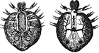 Форму тела карпоед, как показывает нам рисунок, имеет овальную и походит на нечто вроде зеленовато-бурой небольшой лепешечки. Из этого щита выглядывают 4 пары расщепленных ног и хвостовой плавник, служащий по тонкости своего покрова органом дыхания. На спине находятся два сложных глаза, находящихся постоянно в каком-то странном дрожании, производимым, вероятно, пучком мускулов, окружающих зрительный нерв. Как раз близ глаз находится и голова этого рачка. Голова снабжена сосательным аппаратом, и по бокам ее помещаются два присоска, с помощью которых рачок прикрепляется к телу тех рыб, кровью которых питается.